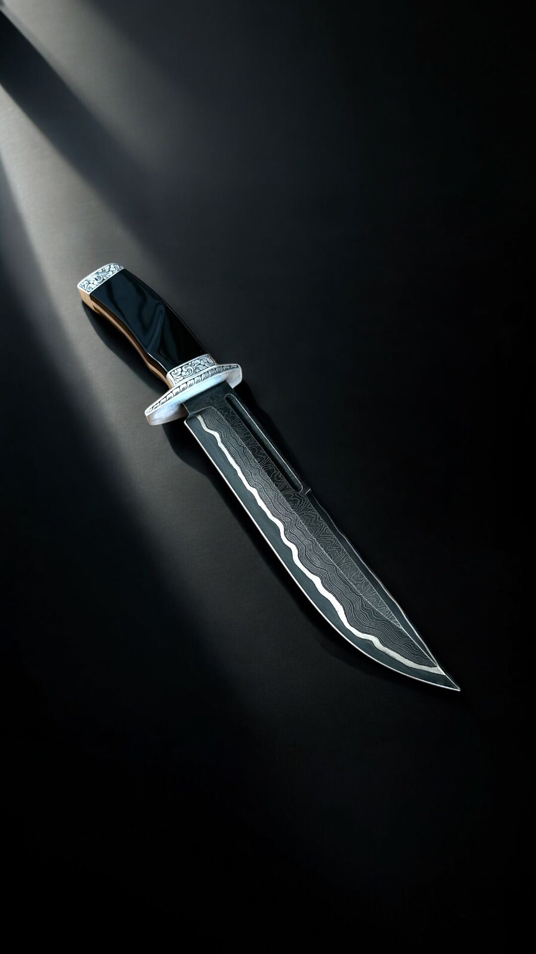 Ülkemizde yalnızca bir elin parmakları kadar sınırlı sayıda üretilen bu benzersiz Damascus Nikelli San Mai Bowie Bıçak, el işçiliğinin zirvesini temsil eder. Paslanmaz çelik kasası ve kabza kapağı ile üstün dayanıklılık sağlanırken, doğal buffalo boynuzundan yapılmış kabza, bıçağa eşsiz bir karakter katar.