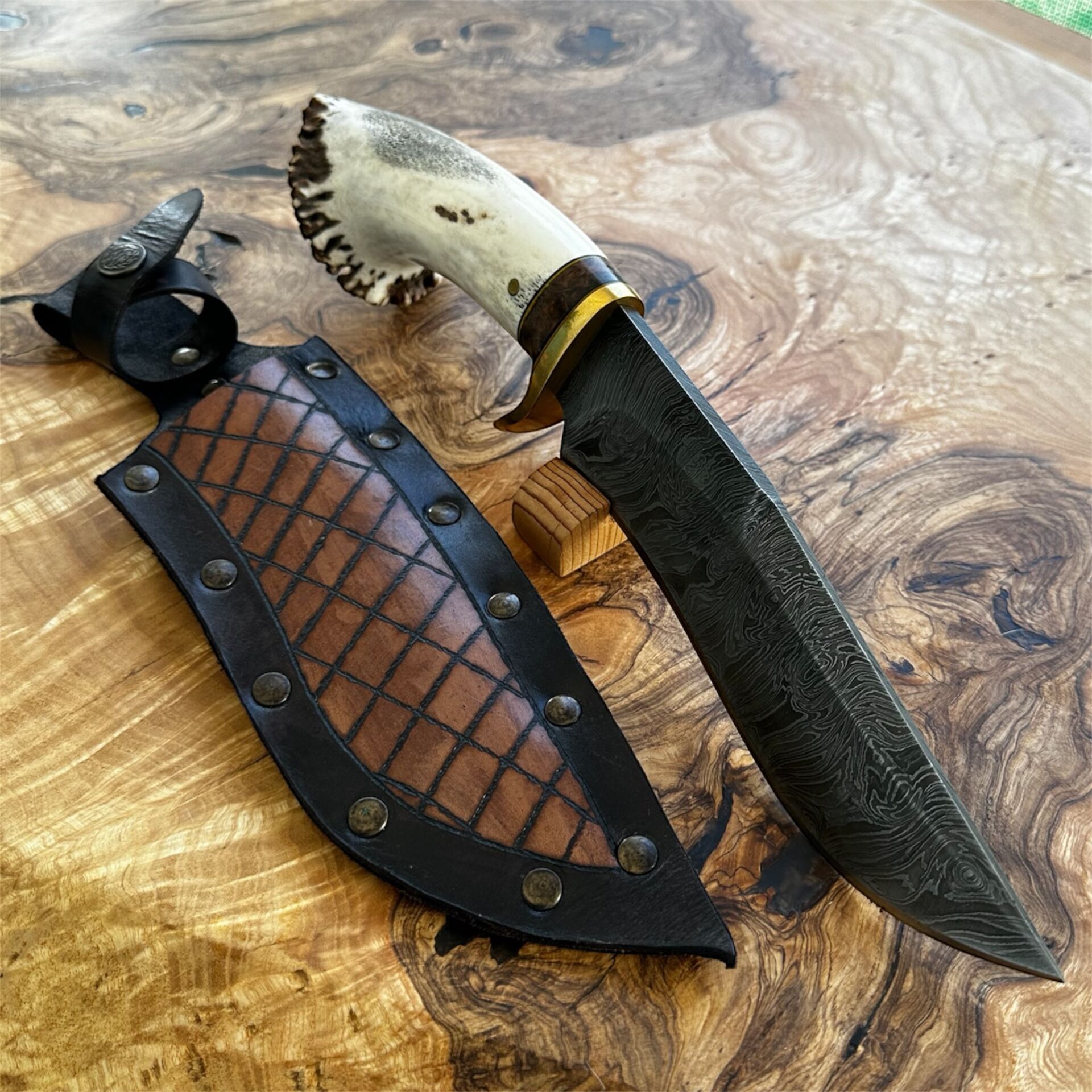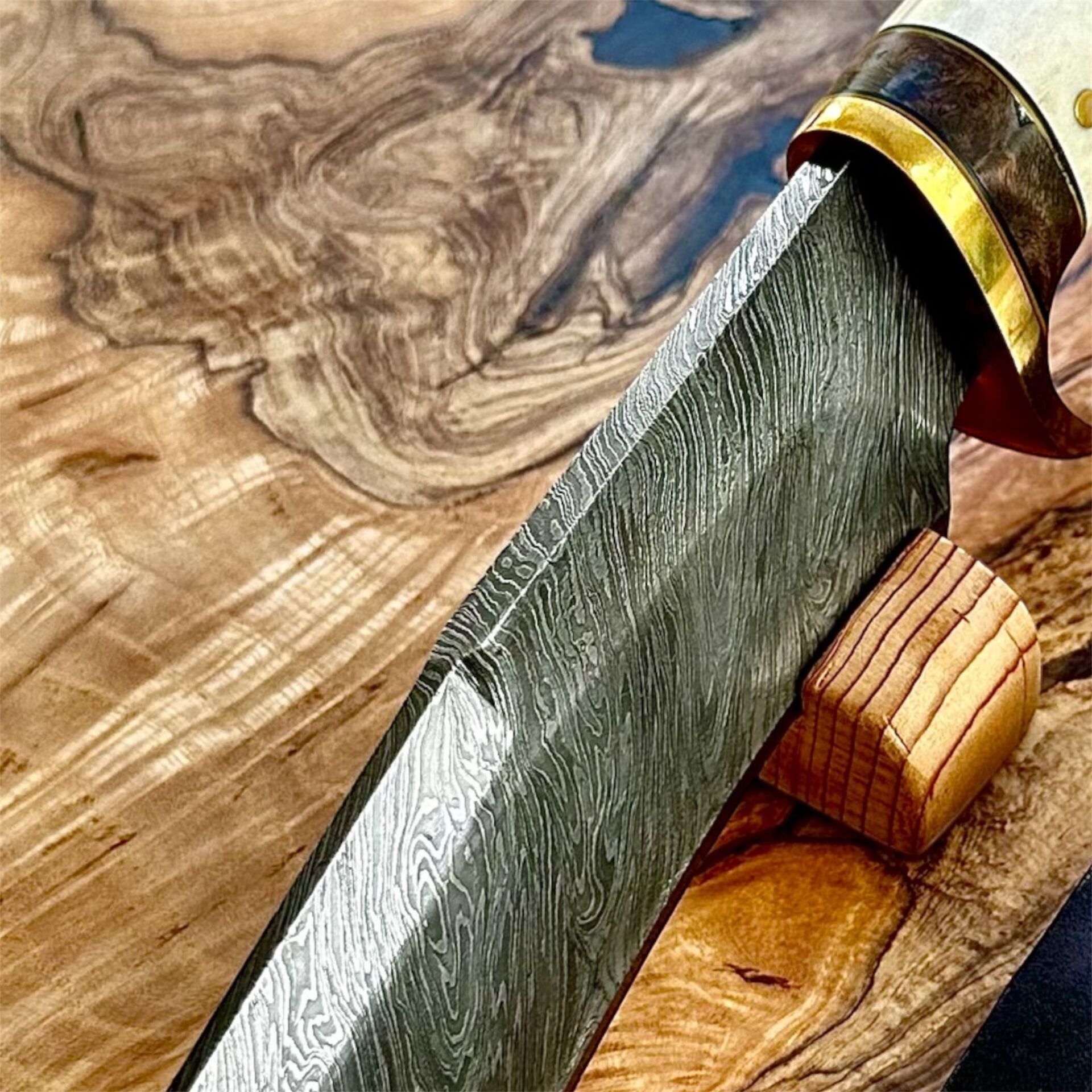 Bu özel üretim Damascus Bowie bıçak, 15N20 + O2 çeliklerinden oluşan Şam Çeliği olarak dövülmüştür. Katmanlı yapısı, hem estetik derinlik hem de keskinlik ve dayanıklılık açısından üst düzey performans sunar.
