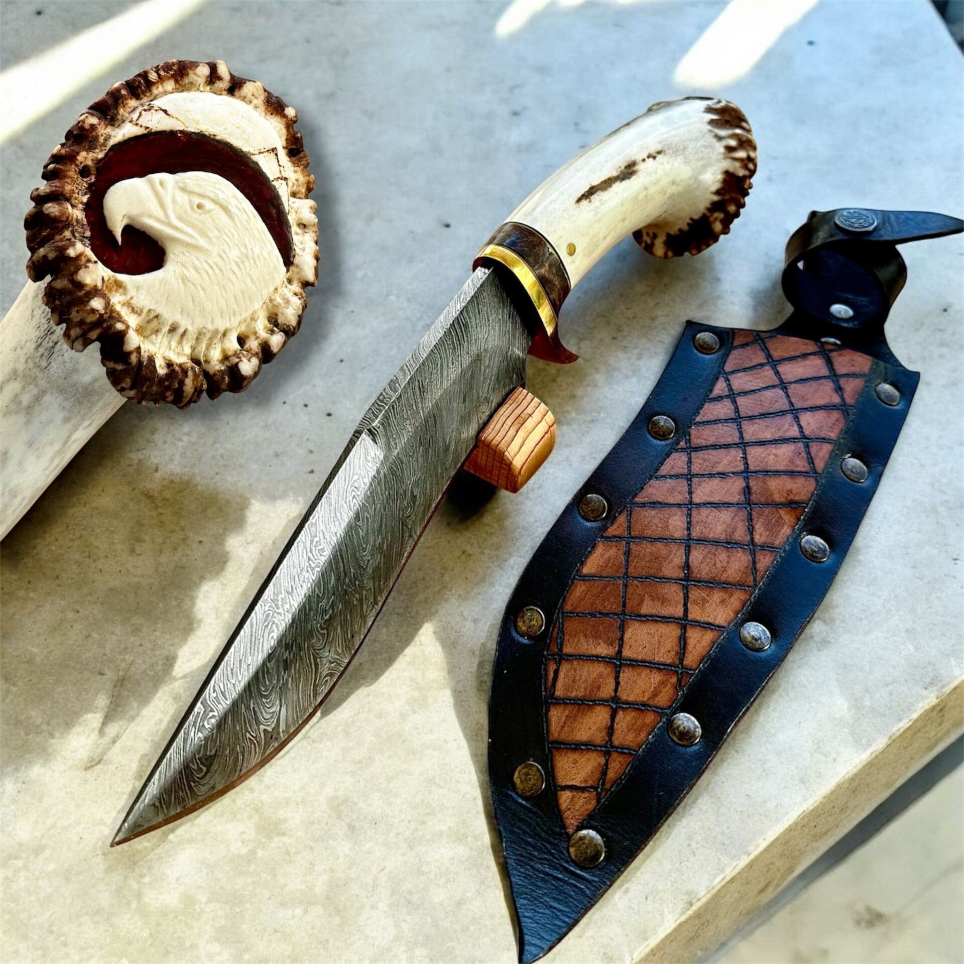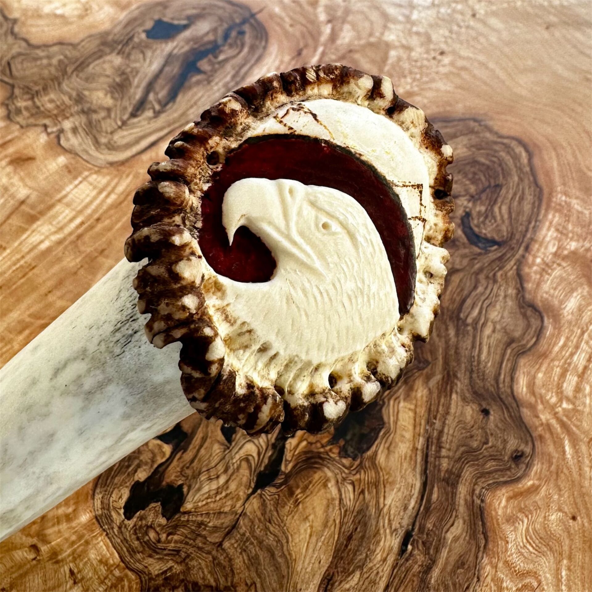 Bıçağın kabzasında yer alan kartal gravürü, tamamen el işçiliğiyle işlenmiş olup; doğaya, güce ve özgürlüğe gönderme yapar. Kök boynuz kabza, doğal yapısıyla her bıçakta farklı bir desen sunar, bu da her ürünü eşsiz kılar.