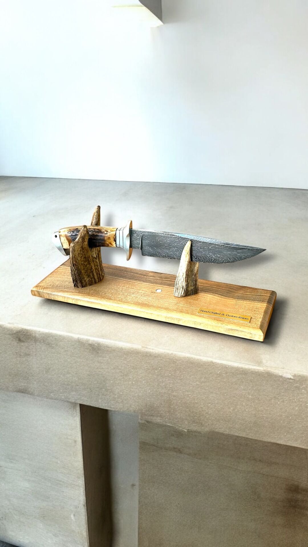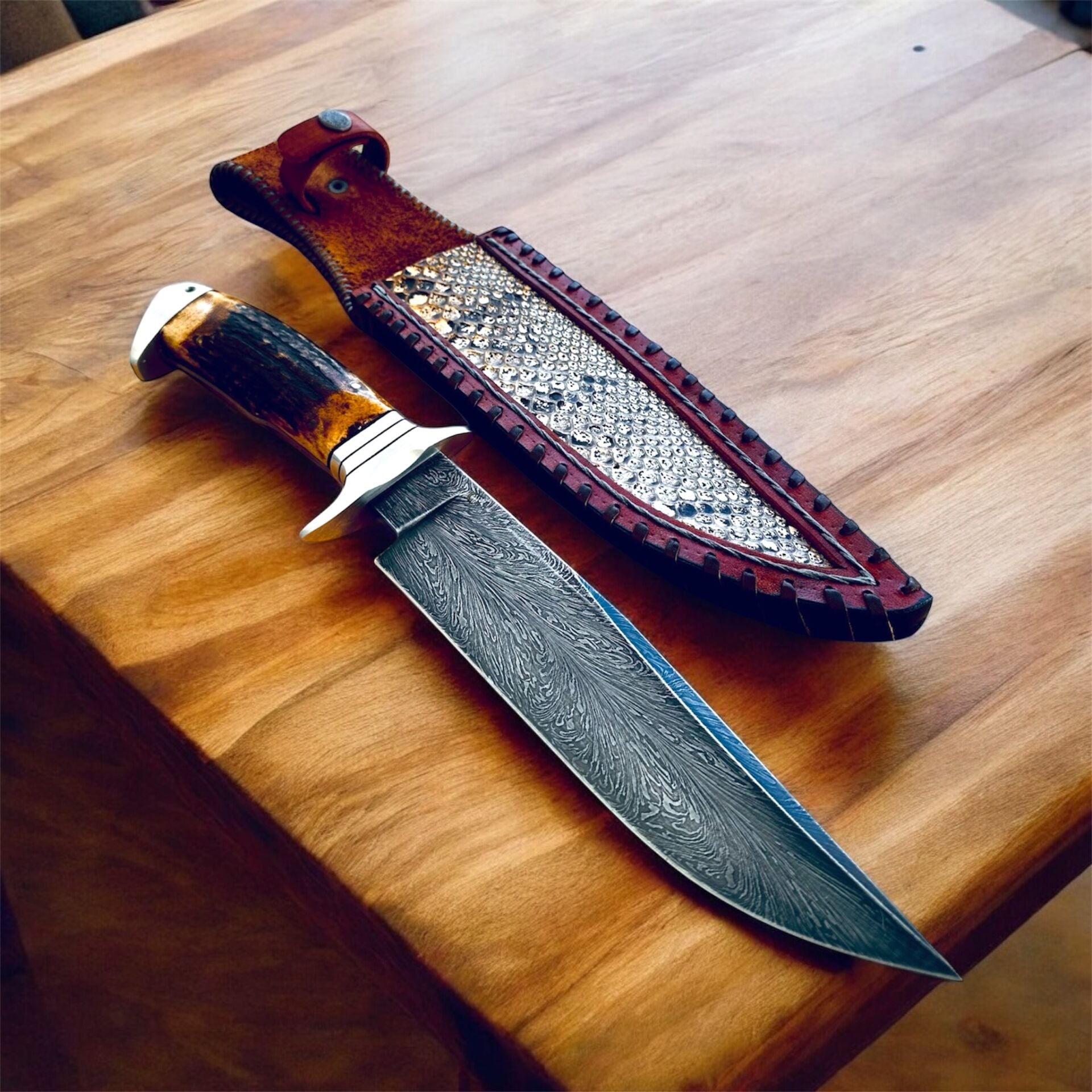 Eskitme geyik boynuzu kabza, doğallığın ve sağlamlığın harmanlandığı seçkin bir detaydır. 36 cm toplam uzunluğu ve 5 mm kalınlığıyla güçlü yapıya sahip bu bowie bıçak, el yapımı piton derisi kılıf ile tamamlanır. Her yönüyle özel, zarif ve koleksiyon değerinde bir üründür.