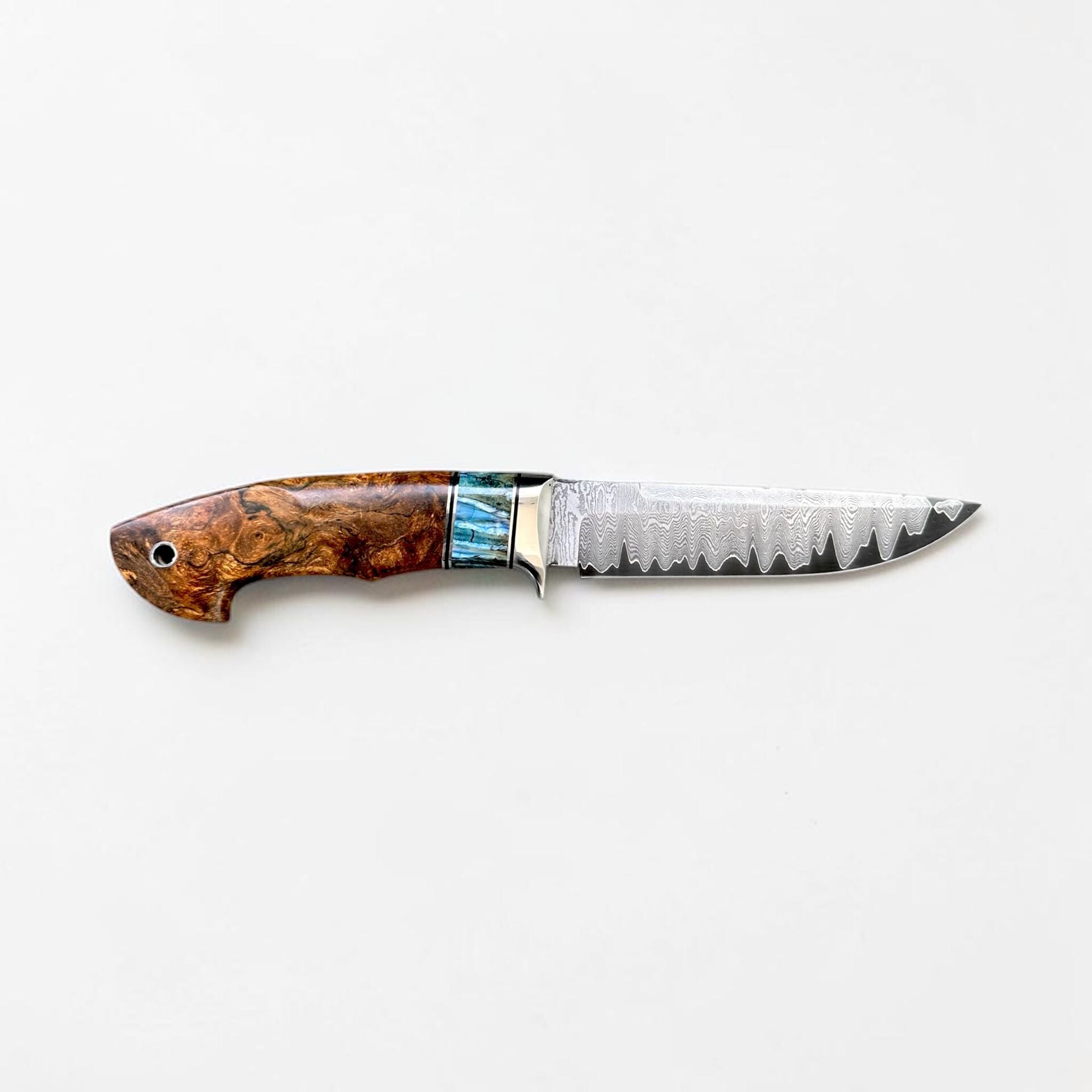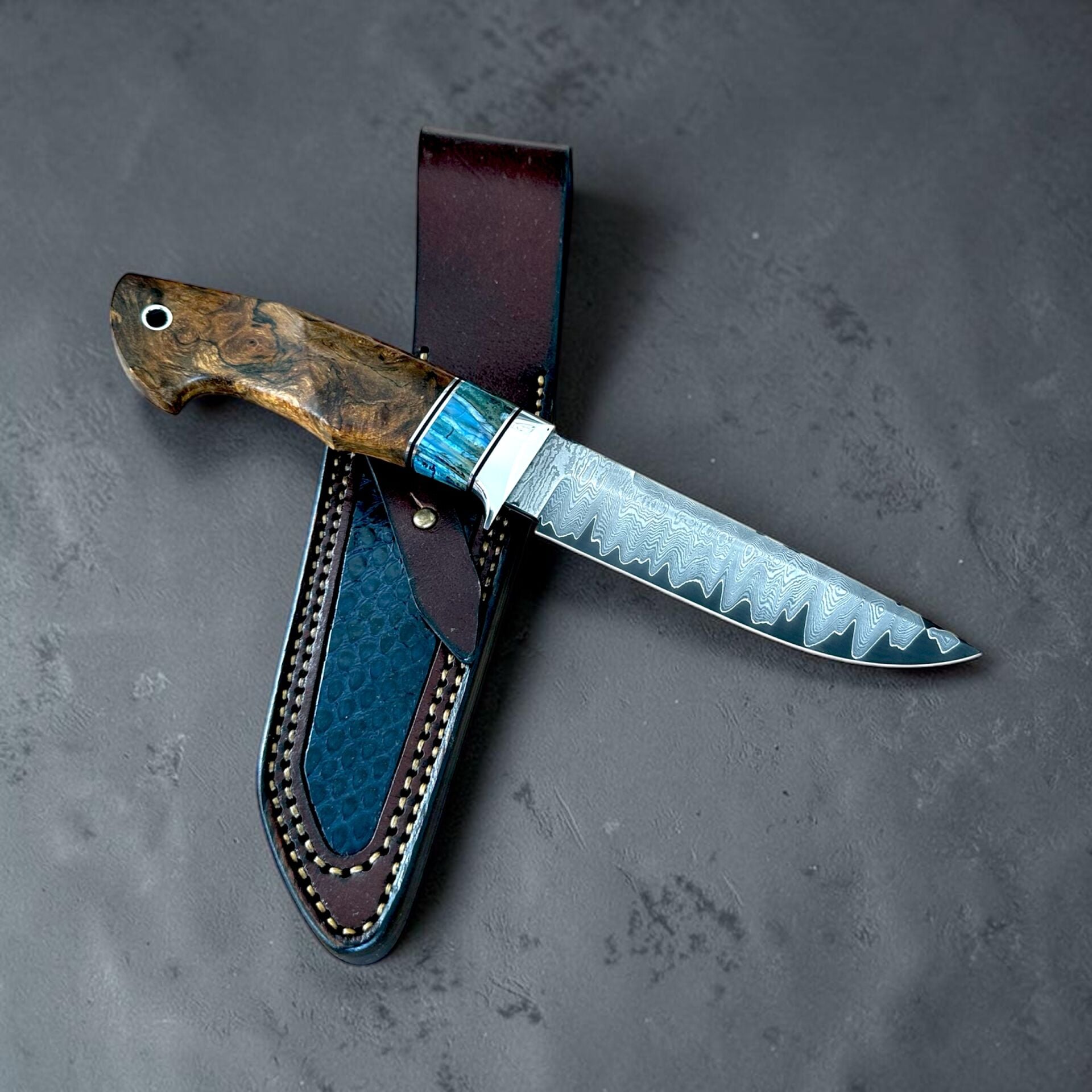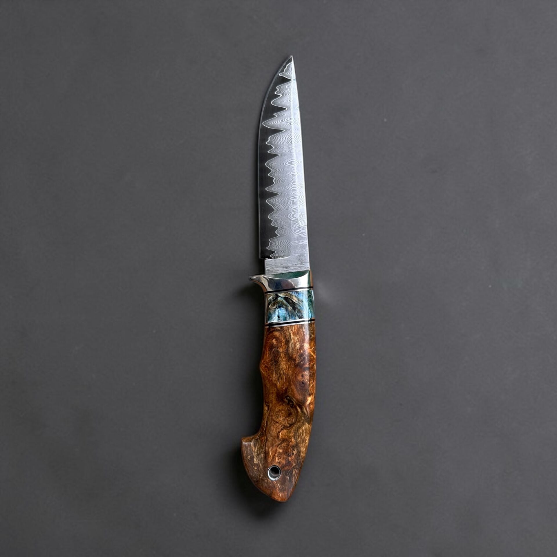 Kabzada kullanılan stabilize urlu amboyna ve mamut dişi kombinasyonu, paslanmaz damascus yapının premium karakterini tamamlar. 18/10 paslanmaz balçak ile bütünsel bir kalite hissi sunulmuştur.