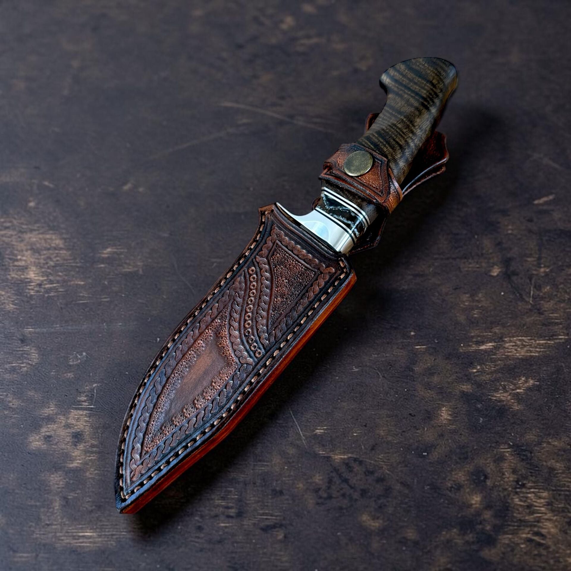 Kabzada kullanılan stabilize ceviz ve mamut dişi kombinasyonu, RWL-34 paslanmaz damascus yapının premium karakterini tamamlar. 18/10 paslanmaz balçak ile bütünsel kalite hissi güçlendirilmiştir.